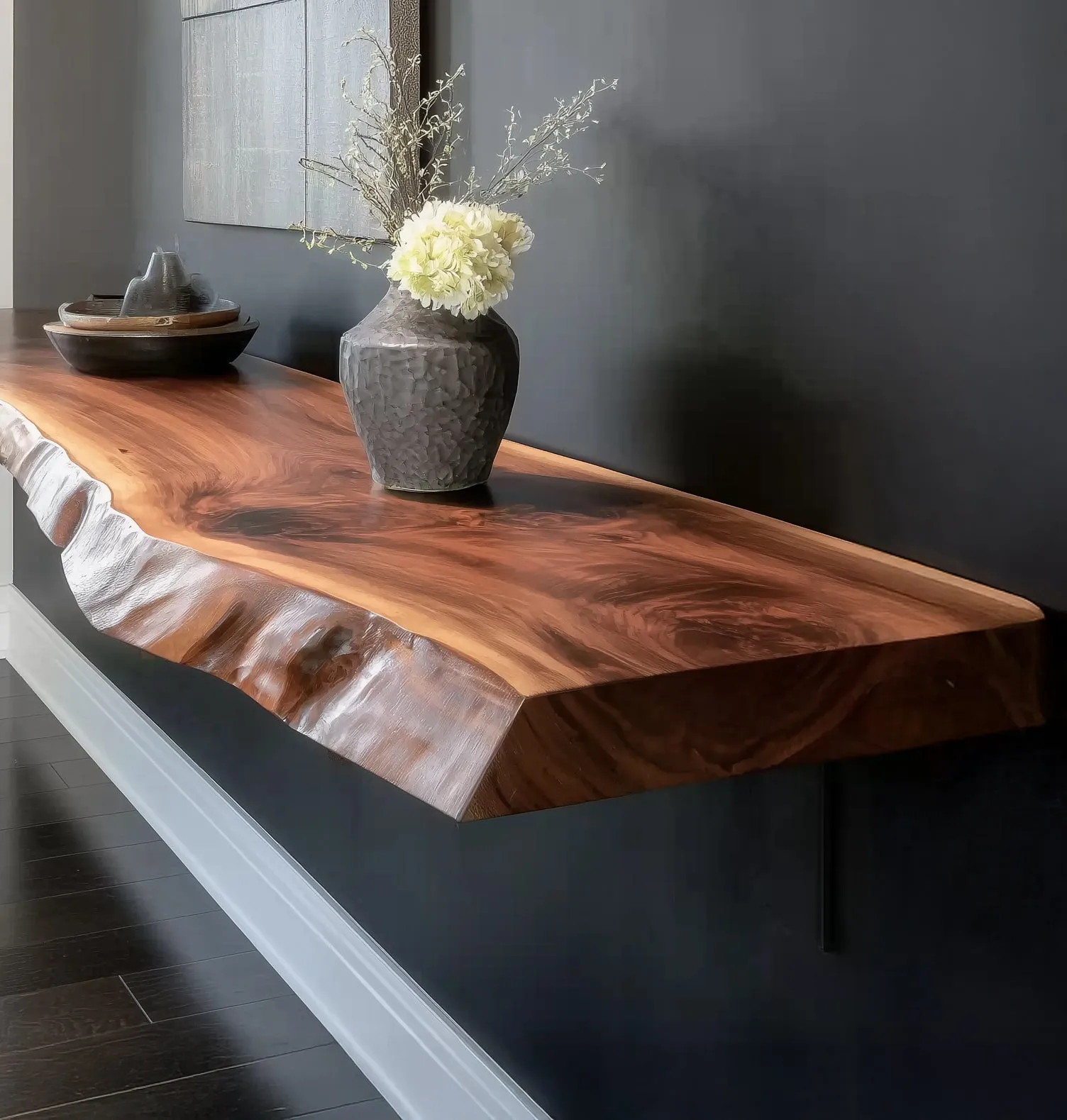Bring warmth and character to a tight corner with a long solid wood display shelf shaped with a natural edge. The smooth front follows the irregular contour of the timber so the line looks organic, while the top surface is planed flat for everyday use. It is an inviting place to rest a small plant, a framed photo or the book you are reading right now, and it instantly turns unused wall space into useful storage with a crafted feel.